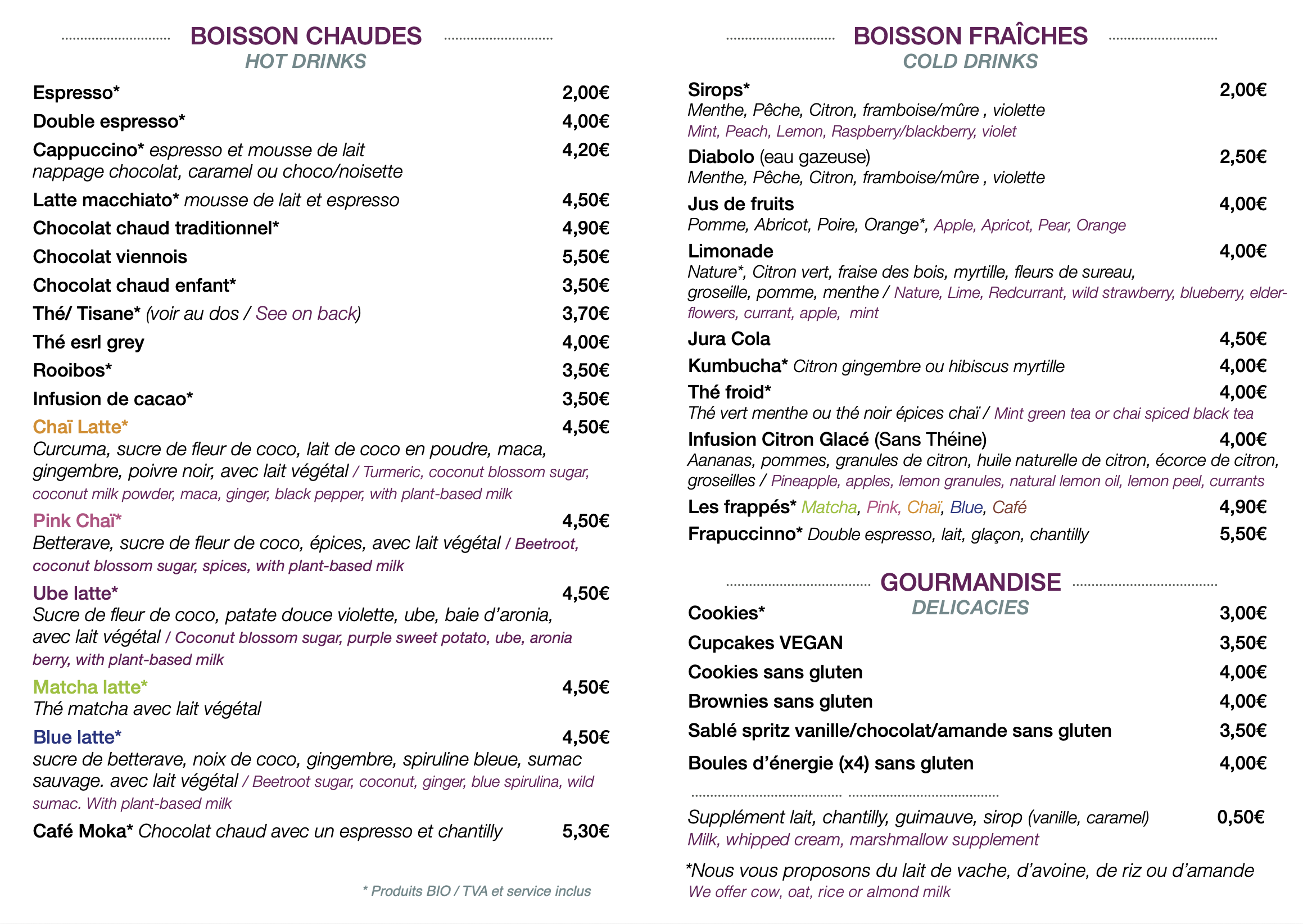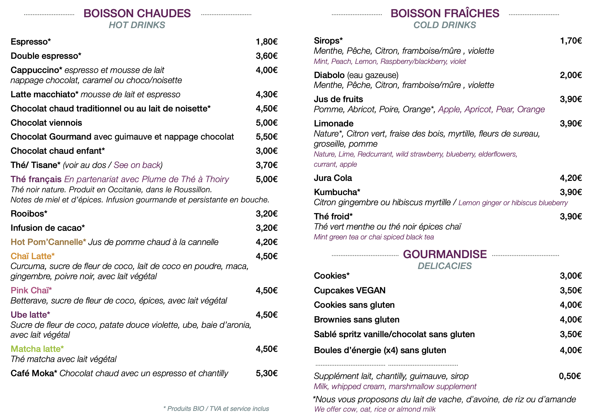 Venez avec un bouquin, un.e ami.e pour profiter d’un moment de détente aux senteurs florales. Dégustez un café, un thé ou une tisane, des gâteaux faits maison avec amour, des jus de fruits : Pom’Violette c’est un petit café-fleurs avec une carte privilégiant les bons produits bio et/ou locaux.